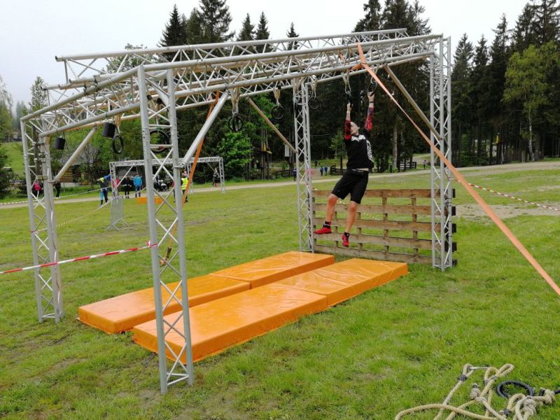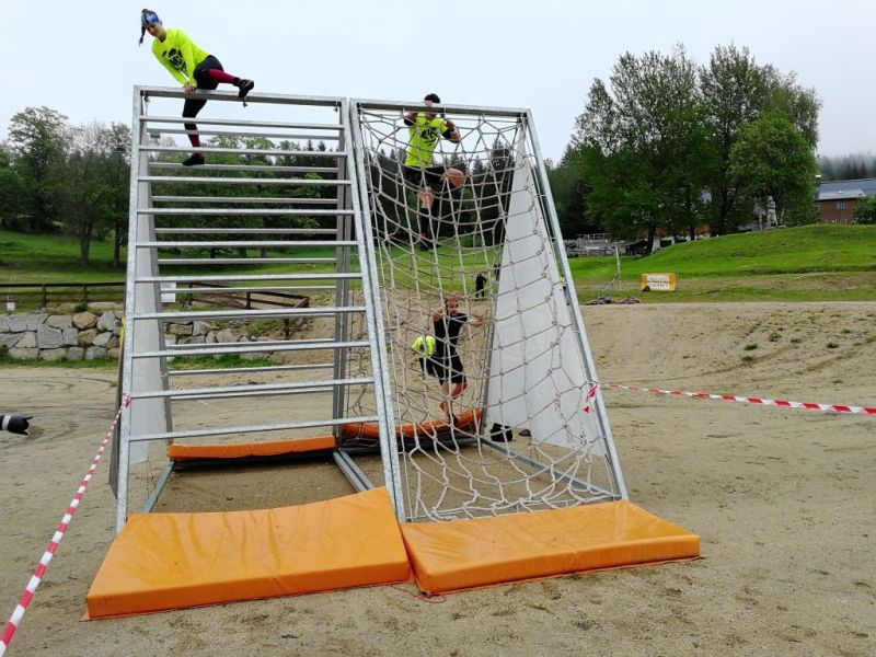 Najviac mi dala zabrať šikmá vysoká stena s lanom. Sklon mala omnoho ostrejší ako Spartansky Slip wall. Najskôr som sa radoval keď vyťahovanie po lane išlo pekne. Na konci lana - hore však nastal problém. Lano nešlo cez hornú hranu, vtedy sa silným pritiahnutím vyšvihnem a nohou sa zapriem o vrch. Tu však lano bolo vypustené priamo zo steny asi 15 cm od vrchu. Tak som sa ledva zachytil prstami o hranu a pleskol som telom o slizký povrch steny ako vianočný kapor vo vypúšťanej vani. Chcel som sa poriadne zaháknuť prstami o vrchnú hranu ale zrada. Oba panely A-čka boli hore úplne pri sebe a spolu boli také široké, že som sa musel zachytiť lakťami a vytiahnuť s vypätím síl cez vrch.